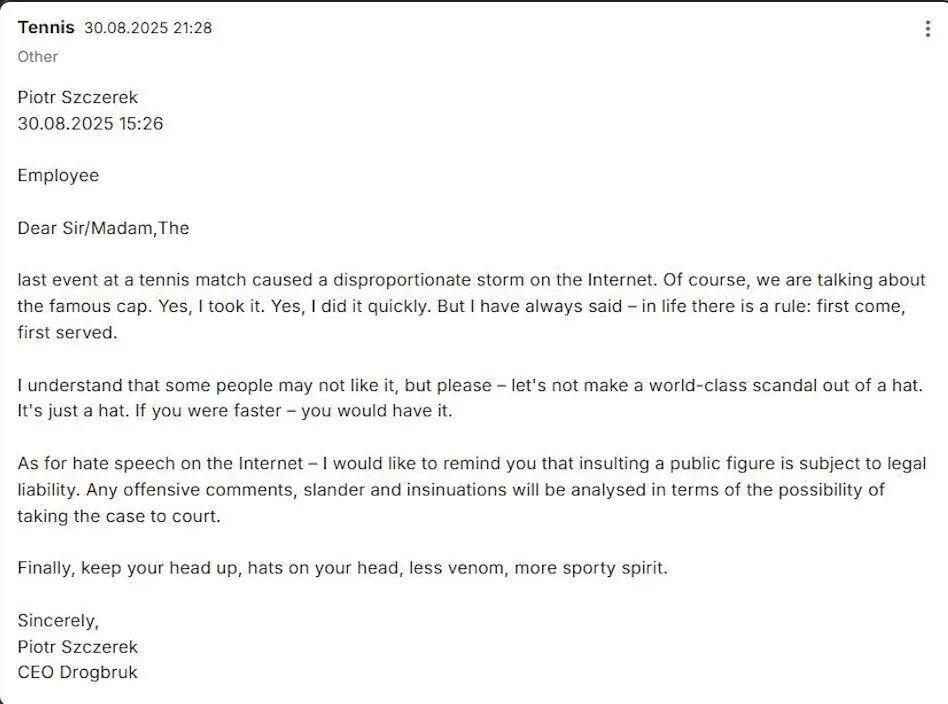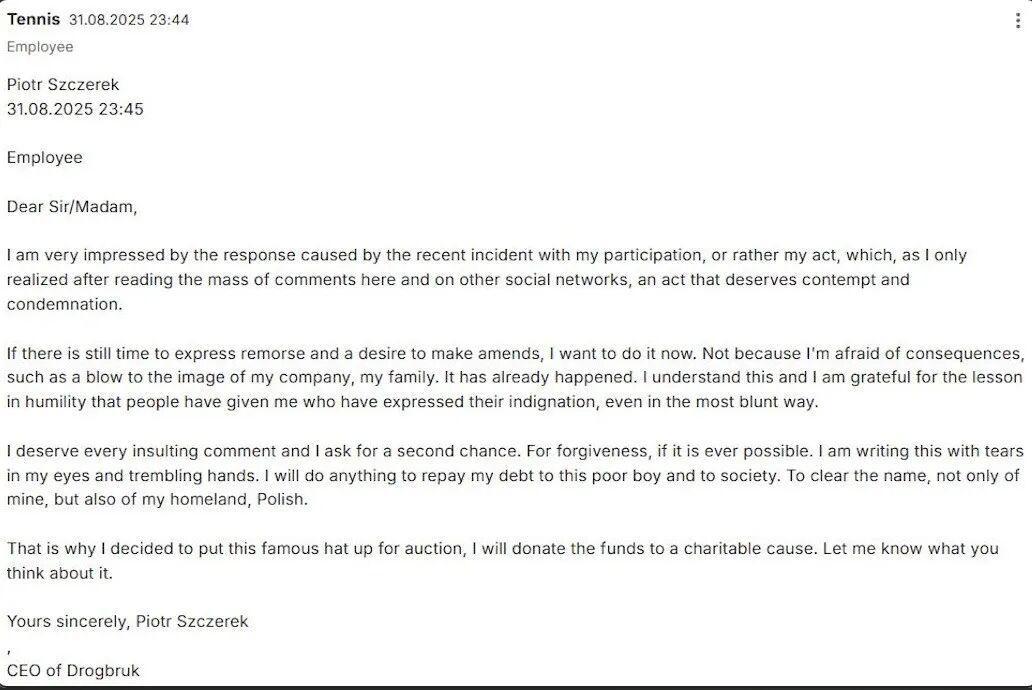 抢帽事件后不久,一份疑似斯泽雷克发布在社媒平台Gowork上的声明开始在网上疯转,引发了网友更大的愤怒。