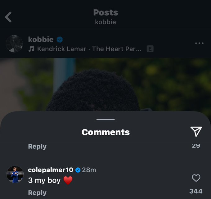 帕尔默在社交媒体上和科比·梅努互动:3my boy[心]